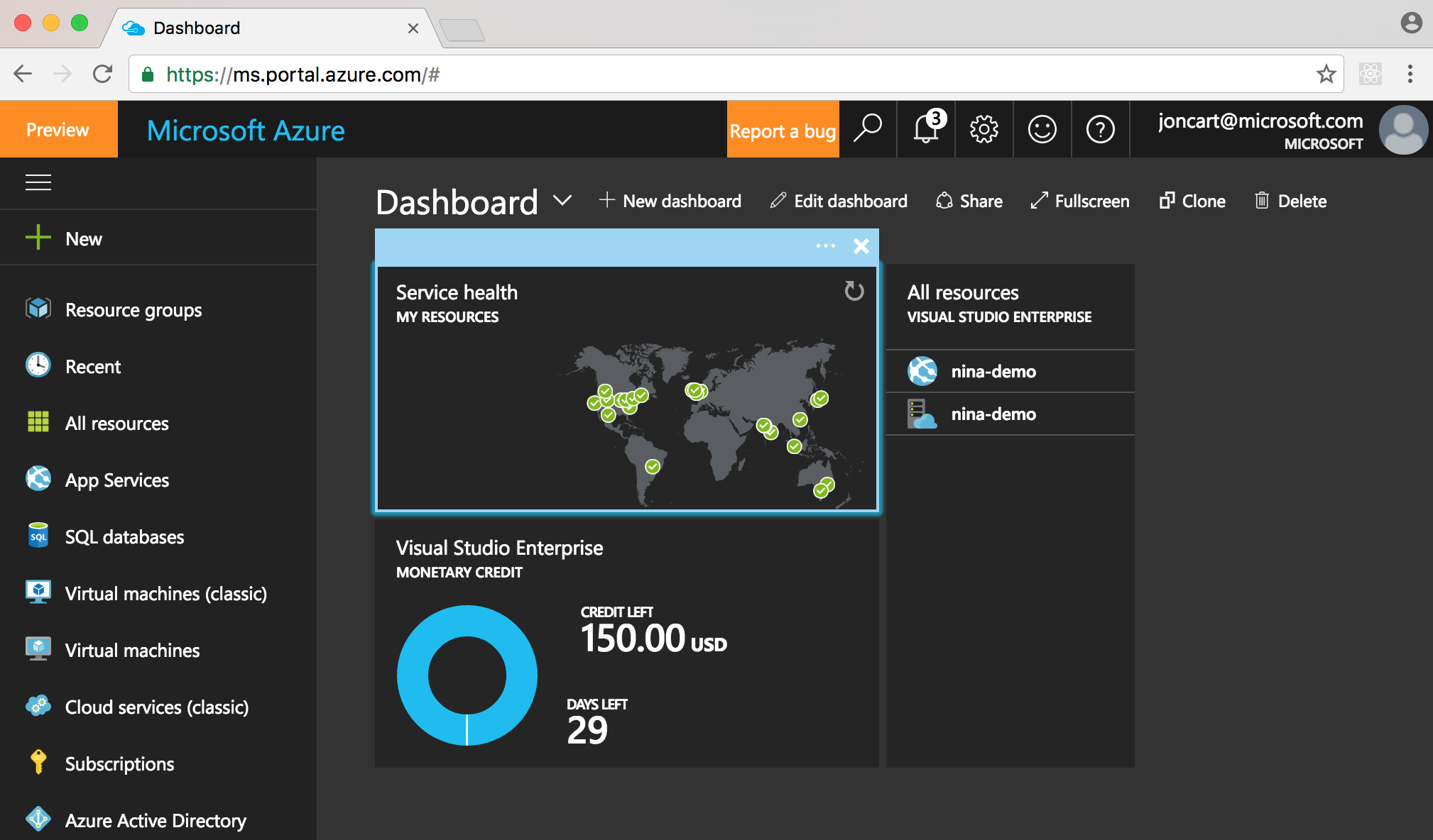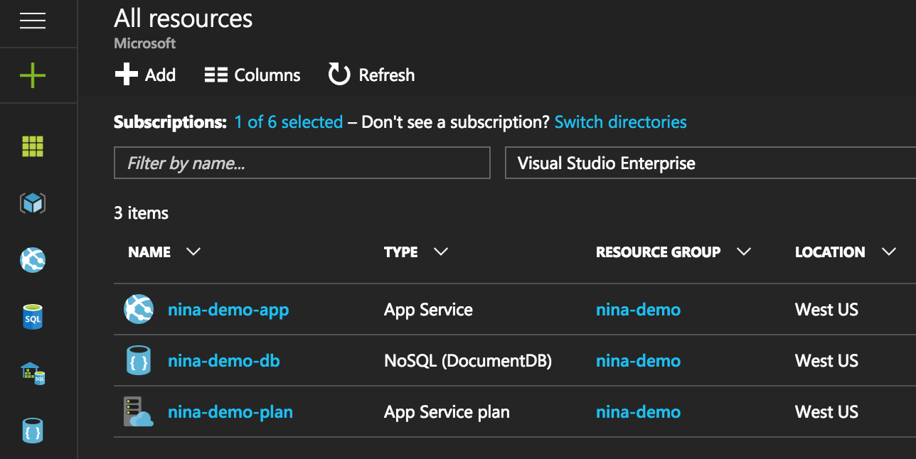 完全建立 DocumentDB 例項需要幾分鐘時間,因此請等到您在門戶右上角看到部署成功通知。完成後,導航到左側導航欄上的 All Resources 選項卡(帶有綠色網格圖示的選單項),然後選擇您建立的 DocumentDB 資源
