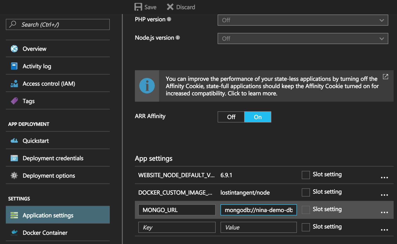 返回門戶中的 All Resources 頁面,導航到您之前建立的 App Service 例項。單擊 Settings 部分下的 Application Settings 選單項,然後在 App settings 部分下新增一個新條目,其鍵為 MONGO_URL,其值為我們之前複製的 DocumentDB 連線字串。