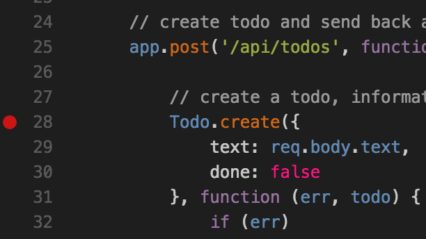 讓我們在第 28 行設定一個斷點,該行表示當我們的應用程式嘗試新增待辦事項時將呼叫的 Express 路由。要設定斷點,只需單擊編輯器中行號左側的裝訂線