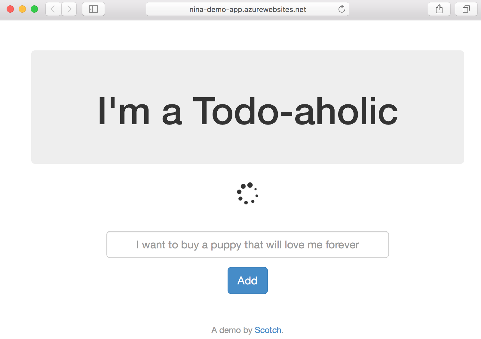 耶!我們剛剛部署了應用程式。但是,旋轉圖標表示應用程式無法連線到資料庫,這是有道理的,因為我們在開發期間使用的是本地 MongoDB 例項,這顯然無法從 Azure 資料中心訪問。幸運的是,由於我們更新了應用程式以透過環境變數接受連線字串,我們只需要啟動一個 MongoDB 伺服器並重新配置 App Service 例項以引用它。