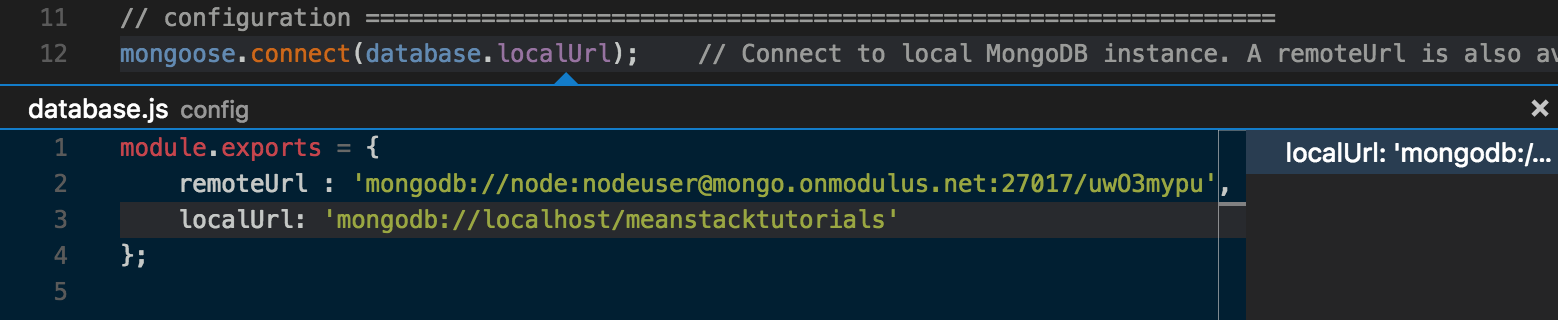 database.localUrl,然後選擇Peek Definition,這使我們能夠快速檢視應用程式如何配置為預設連線到 MongoDB。