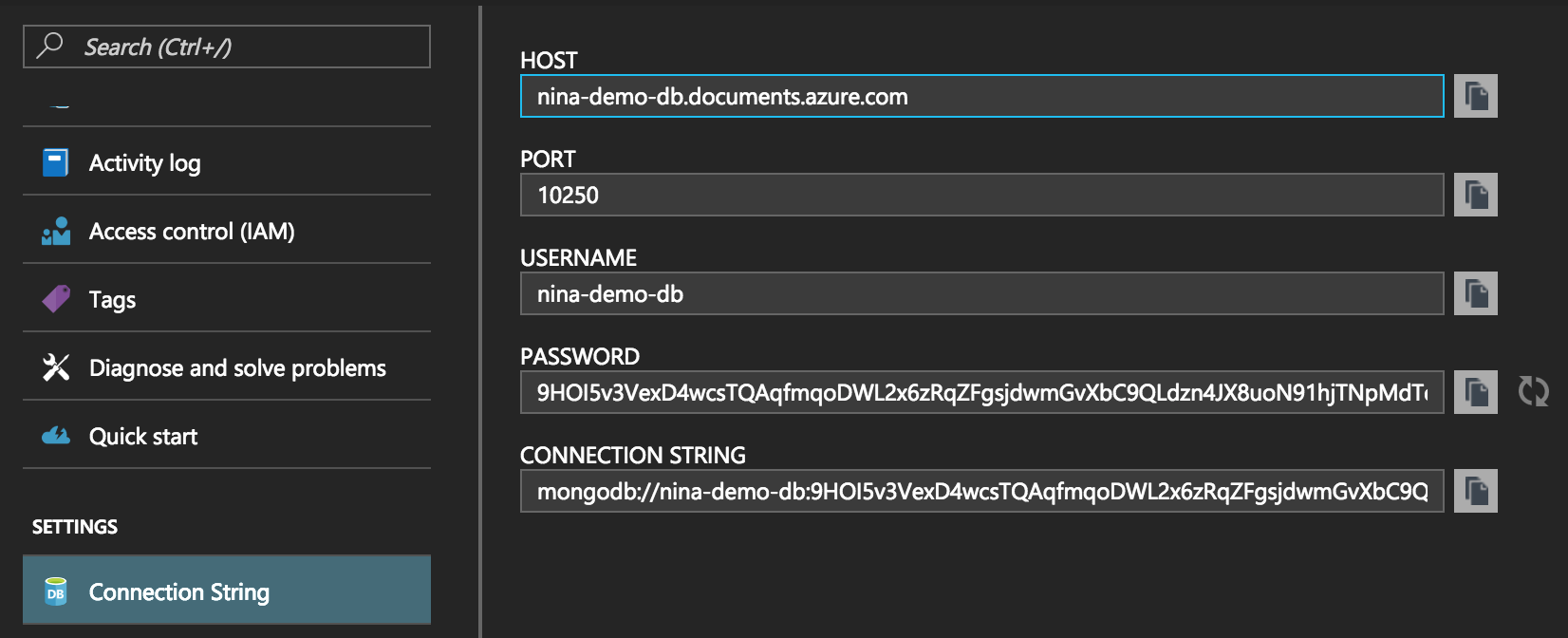 單擊 Settings 部分下的 Connection String 選單項,然後單擊 Connection String 欄位旁邊的複製按鈕,將 MongoDB 連線字串複製到剪貼簿。
