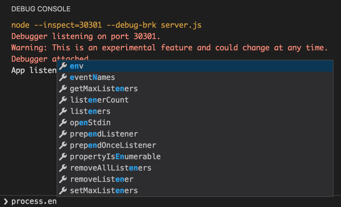 此外,此控制檯實際上已附加到我們新執行的應用程式,因此您可以鍵入 JavaScript 表示式,這些表示式將在應用程式中進行評估,並且還包括自動補全!例如,嘗試在控制檯中鍵入 process.env 以檢視我的意思。