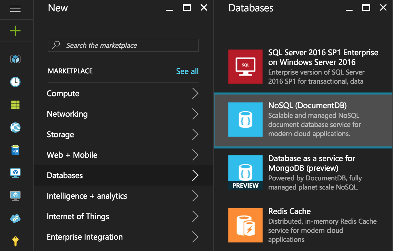 N鍵建立新的 Azure 資源,然後選擇Databases,然後選擇NoSQL (DocumentDB)