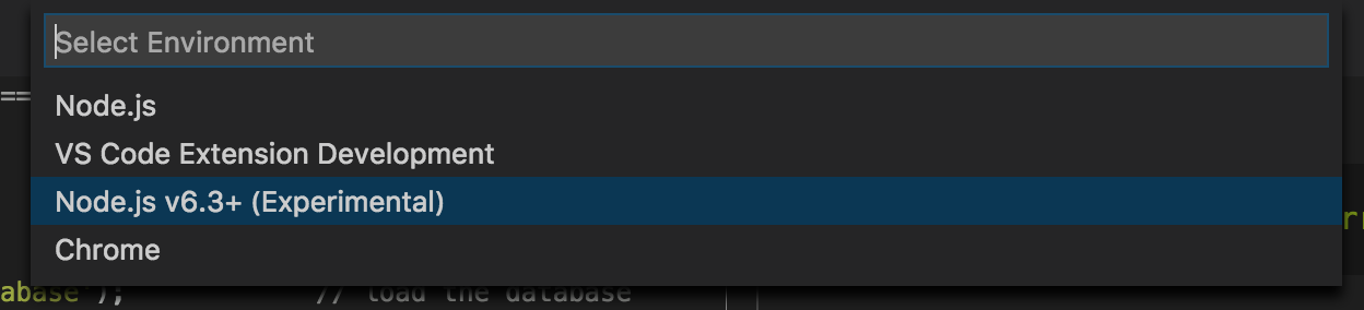 選擇 Node.js v6.3+ (Experimental),它將使用最近新增到 Node.js 中的新 Chrome Debugging Protocol 支援。這樣做會在您的專案中生成一個名為 launch.json 的新檔案,該檔案只是告訴 VS Code 如何啟動和/或附加到您的應用程式以進行除錯。