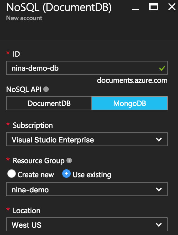 NoSQL API配置為使用MongoDB,並將其Resource Group配置為Use Existing並選擇您為 App Service 例項建立的相同資源組。