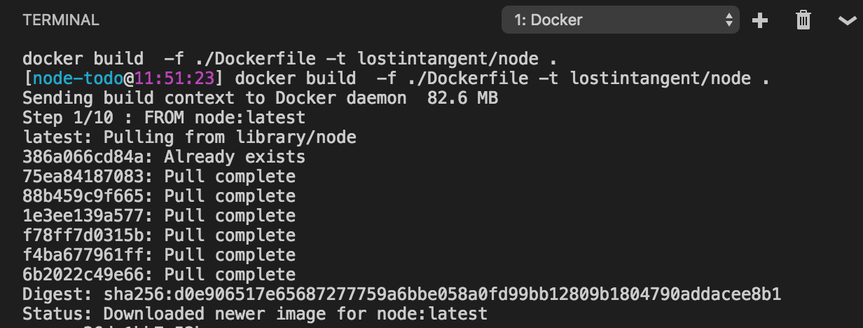 現在我們有了 Dockerfile,我們需要構建實際的 Docker 映象。同樣,我們可以使用 Docker 擴充套件安裝的命令,方法是按 F1 並輸入 dockerb(使用“模糊搜尋”)。選擇 Docker: Build Image 命令,選擇我們剛剛生成/編輯的 /Dockerfile,然後為映象提供一個包含您的 DockerHub 使用者名稱的標籤(例如 lostintangent/node)。按 <ENTER>,這將啟動整合終端視窗並顯示正在構建的 Docker 映象的輸出。