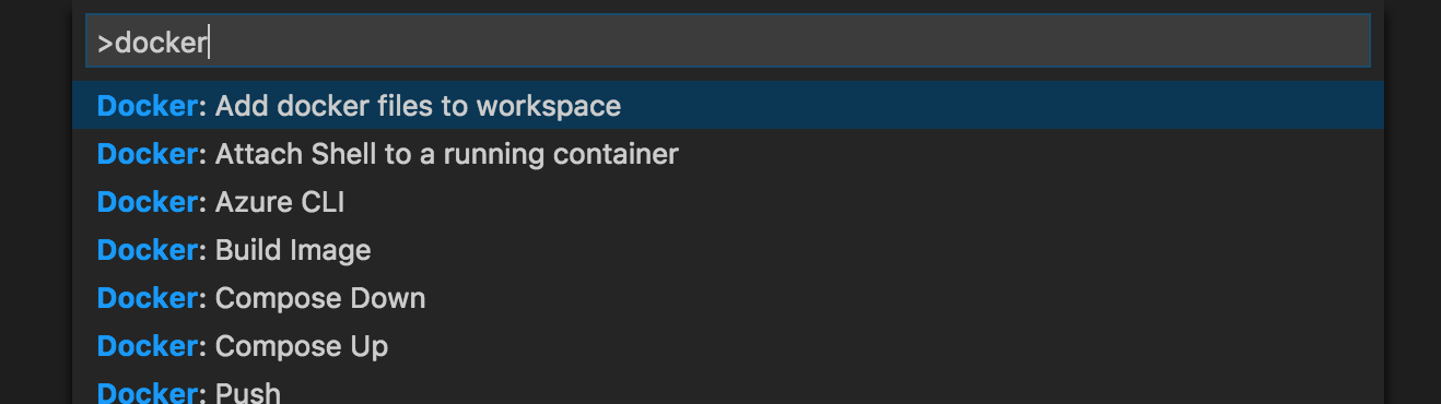 此擴充套件包括許多內容,其中之一是用於為現有專案生成 Dockerfile 和 docker-compose.yml 檔案的簡單命令。要檢視實際操作,請按 F1(調出命令面板)並鍵入 docker 以顯示 Docker 擴充套件提供的所有命令