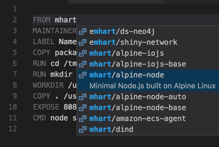 將游標放在 mhart 中的 t 之後,按 CTRL+Space 檢視 mhart 在 DockerHub 上釋出的所有映象儲存庫。