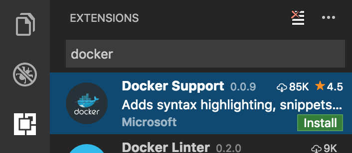 切換回擴充套件選項卡,搜尋 docker 並選擇 Microsoft Docker 擴充套件。安裝它,然後重新載入 VS Code,就像我們上面為 Chrome 擴充套件所做的那樣。