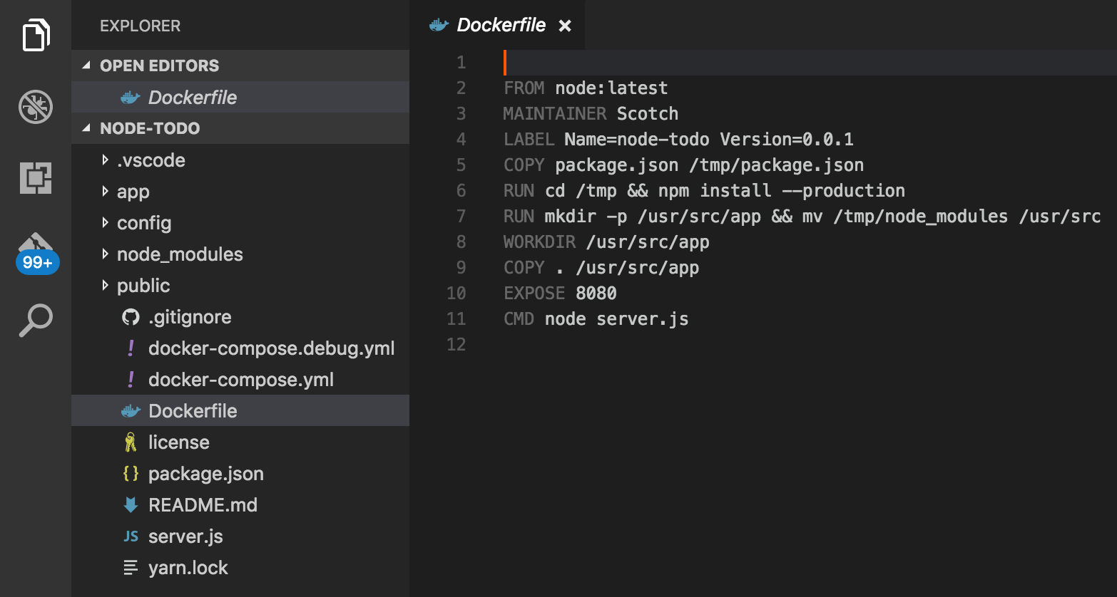 說到微服務,讓我們看看 VS Code 為 Docker 開發提供的體驗。許多 Node.js 開發人員正在使用 Docker 為開發、CI 和生產環境提供可移植的應用程式部署。儘管如此,我們聽到了很多反饋,雖然 Docker 的好處非常高,但入門的學習曲線和成本也可能相當高。VS Code 提供了一個擴充套件,試圖幫助簡化一些入門工作!