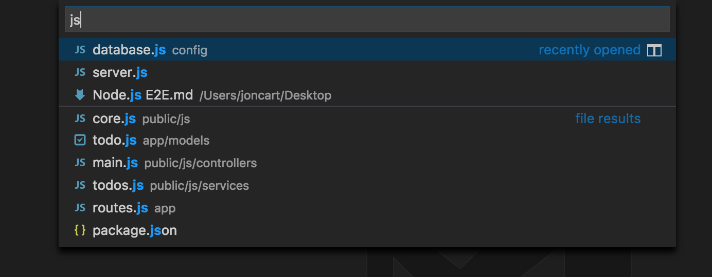 CMD+P並輸入.js,這使您可以看到專案中的所有 JavaScript/JSON 檔案,以及它們所在的目錄。同樣,此對話方塊支援與命令面板相同的“模糊搜尋”,因此它非常靈活。