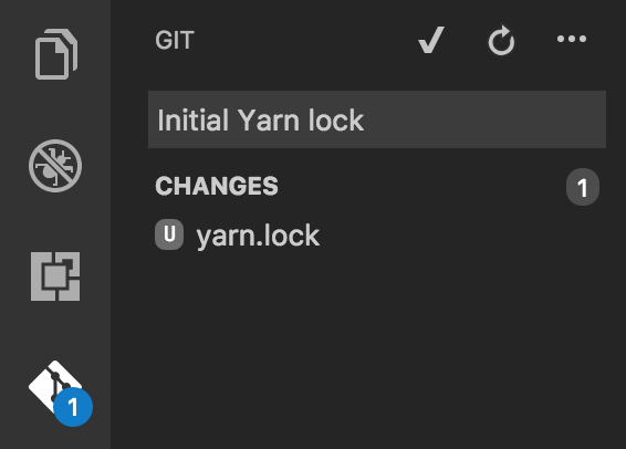 建議將此檔案簽入原始碼控制,為此,您可以輕鬆切換到 VS Code 中的整合 Git 選項卡(帶有 Git 徽標的選項卡),並注意新新增的檔案。您可以輸入提交訊息,然後按 CMD+Enter(或單擊複選標記圖示)以在本地暫存/提交更改。