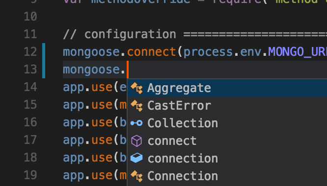 除了內建的 Node.js API 之外,這種型別的自動獲取還適用於 2,000 多個第三方庫,例如 React、Underscore 和 Express。例如,為了防止 Mongoose 在無法連線到配置的 MongoDB 資料庫例項時使示例應用程式崩潰,請將以下程式碼行新增到第 13 行